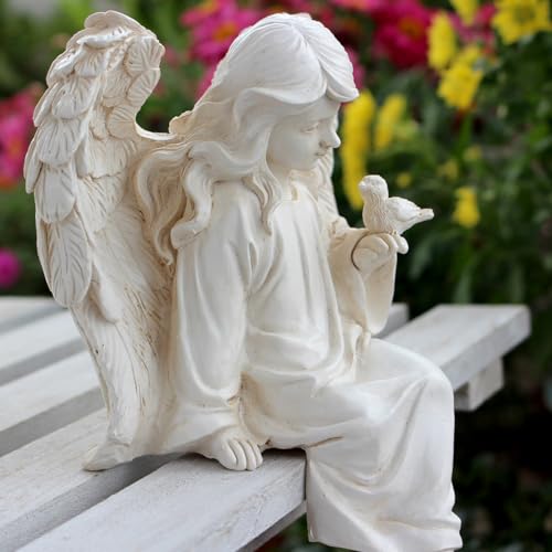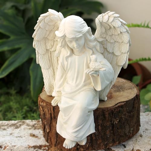 BEAUTIFUL ART: This delicate resin angel statue features a serene expression and flowing robes as she sits holding a bird figurine.