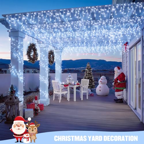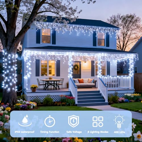 White Icicle Lights for Outside: 400 LED white icicle lights with 80 drops, 48.8ft long (38.8ft lights + 10ft extension cord). These outdoor icicle lights made of 100% copper wire, it will not overheat after many hours of usage. Light up your house or yard with the outdoor Christmas lights for decorations!