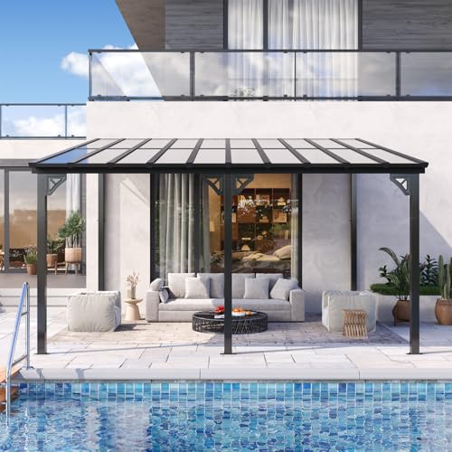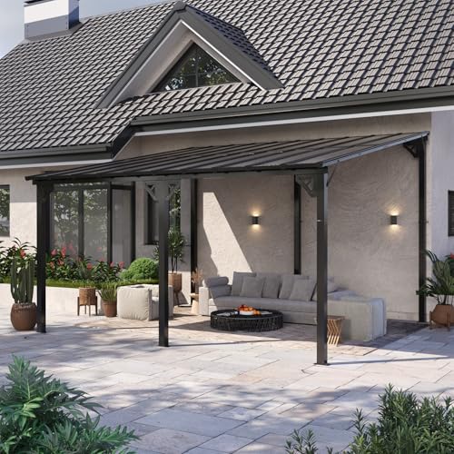 The pergola's top boasts an impressive load-bearing capacity of 55 lbs/?, making it highly resilient to various challenging weather conditions when securely wall-mounted using expansion bolts. Additionally, the polycarbonate top reflects 99% of UV rays, offering exceptional UV protection. With proper installation of ground nails and expansion bolts, the pergola can withstand wind speeds of up to grade 7 (31-38 mph) and supports a maximum snow load depth of 4 inches.