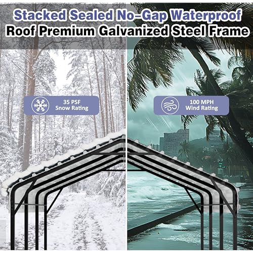Weather Resistant: This metal carport is designed to withstand rain, snow, wind and other weather conditions, industrial grade steel brackets and galvanized steel roof are highly resistant to corrosion, protecting your vehicle from harsh weather and Look great for years to come. Wind Rating: 100 MPH; Snow Load Capacity: 35 PSF.