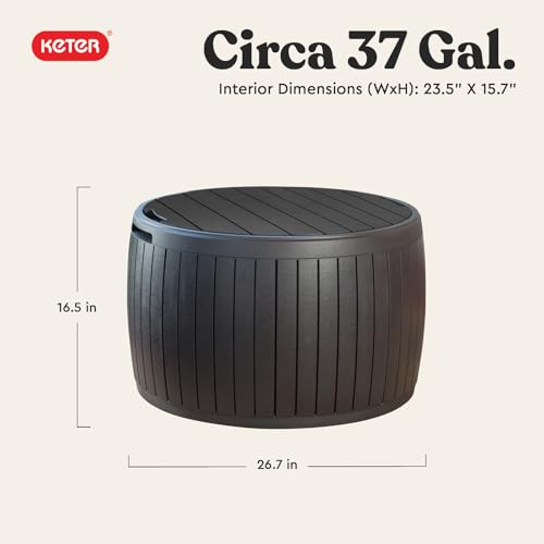 Multipurpose Elegance: Store everything from toys and towels to gardening tools and pool equipment in this Circa round deck box, a multifunctional wood-like textured ottoman for your yard.