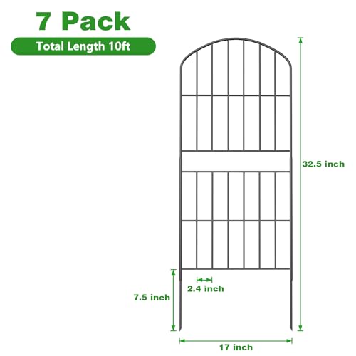 ???????????????????????????? ????????????????????????????????????: Decorative metal garden fence with single panel size 32.5" high x 10" wide, 7 Panels in total. The whole length is 10ft long. You will get 7 Pack no dig fence, 20 Snaps, and 50 cable zip ties.