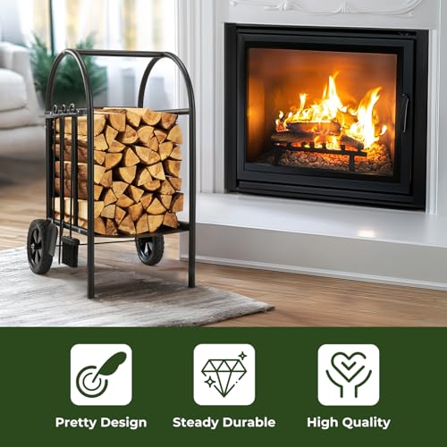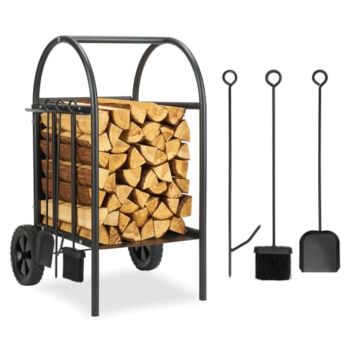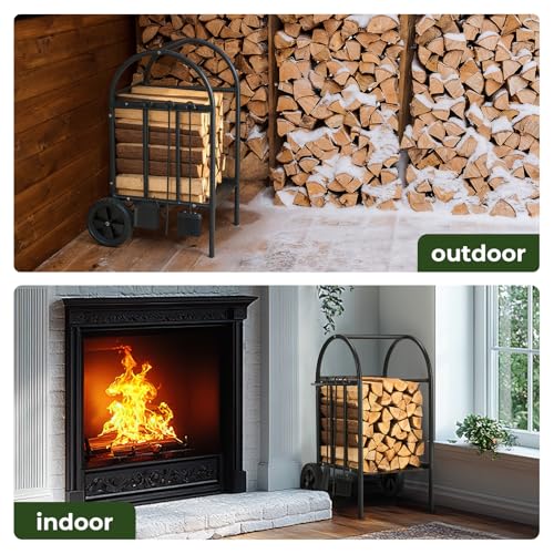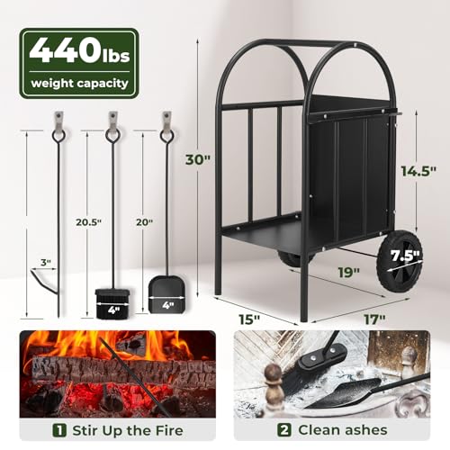 ?Accessories Functions?This firewood cart has guardrails on both sides to prevent firewood from sliding off the sides during transportation. And the firewood rack baffles can keep firewood neatly arranged and effectively prevent ash from falling when storing firewood indoors. Comes with 3 tools, including a poker, brush and shovel, to easily tend to the fire and clean up the debris