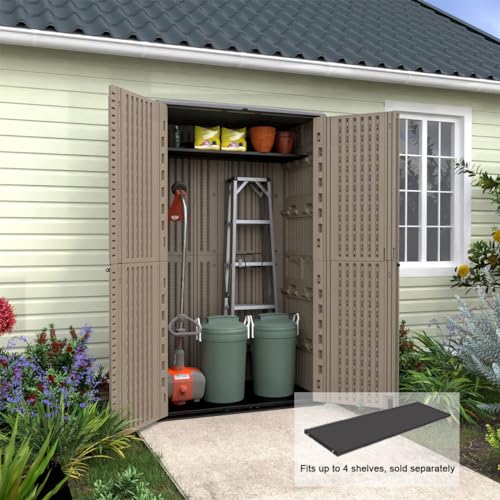 ? TO ENHANCE ITS USABILITY:Customized metal shelves can be purchased to enhance its usability,the plastic shed can fit at most 2 shelves,shelves sold separately.