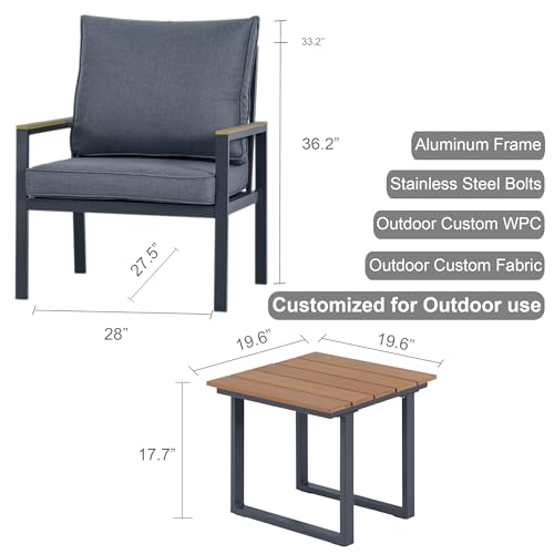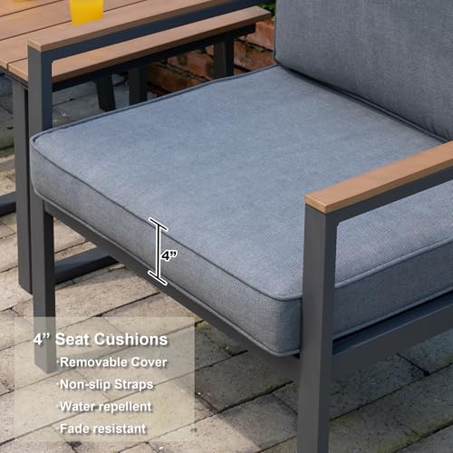 Versatile Elegance for Every Outdoor Scene: Embracing contemporary minimalism, our gray aluminum frames, paired with tasteful faux wood accents, exude a chic and understated aesthetic that gracefully integrates into any outdoor backdrop. Be it a cozy patio corner, a lush garden setting, or beside shimmering pool waters, this furniture ensemble elevates the ambiance with a sophisticated touch, all while adapting effortlessly to your evolving lifestyle and decorative preferences.