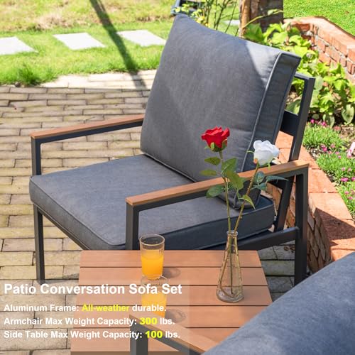 Crafted for Durability and Style: Our outdoor furniture collection is meticulously designed with aluminum framework, fortified by a rust-proof powder coating. This blend of robustness and weather-resistant properties guarantees longevity, promising furniture that stands the test of time. The clever integration of elegant faux wood finishes on the coffee table edges and chair arms elegantly marries form with function, offering a touch of natural charm without the upkeep demands of real wood.
