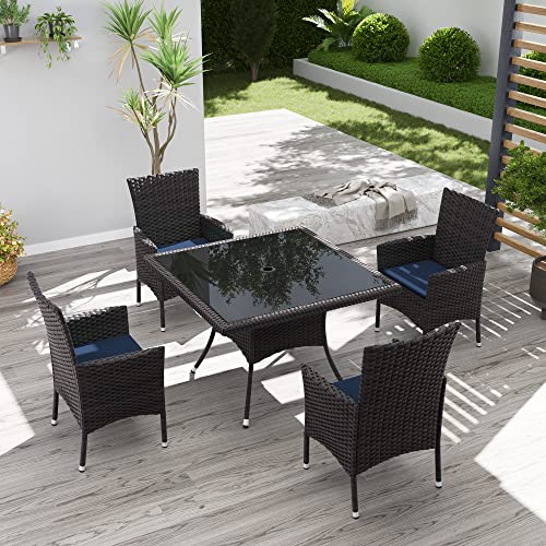 Premium Materials: The 5-piece wicker patio dining set is composed of a sturdy powder-coated steel frame and hand-woven PE rattan(Black and brown intertwined), which can effectively improve overall stability and durability. The covered rattan is hand-woven by experienced craftsmen for a comfortable and smooth touch, suitable for all-weather use
