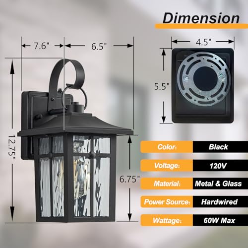 Dimension & Bulb Requirment: The dimension of this outdoor wall mount light fixture: 7.6"L*6.5"W*12.75"H. The included mounting backplate measures 4.5"L × 5.5"H. These dusk to dawn exterior lights are built in standard E26 socket(60W Max), compatible with a variety of incandescent, LED or CFL light bulbs(not include bulbs).