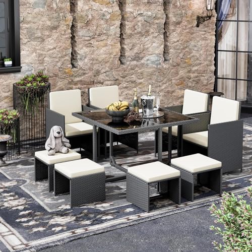 Great Choice for Parties: LHBcraft patio dining set consists of 4 chairs with 4 ottoman and a table. Besides, this outdoor table and chairs set can also be used directly as a 5-piece set on its own. You can spend happy party time together and enjoy delicious food.