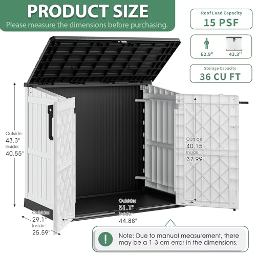 Large Storage Capacity?This horizontal outdoor storage shed has dimensions of 51.1×29.1×43.3 inches and a storage capacity of 36 cubic feet. Though a small storage shed, it offers high space utilization and can store pool accessories, gardening tools, and other items. You can add an extra laminate shelf (48×13 inches, sold separately), making the storage function of this outdoor storage cabinet more flexible.