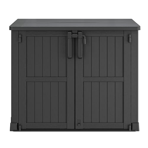 EXTRA LARGE STORAGE CAPACITY - Externally, this storage shed measures 50 inches long * 28.5 inches wide * 44 inches high, with a capacity of 34 cubic feet; perfect for storing gardening tools, small lawn mowers, bicycles, garden furniture and 2 small bins. You can add another laminate shelf (48x13 inches, sold separately), if you want to reduce clutter and save space, placing a storage shed in your yard, garden, backyard, living room or pool is a good choice.