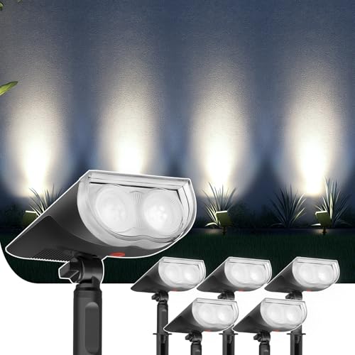 ?Two Lighting Modes? (Daylight White)- Features a large capacity lithium battery and up to 20% photoelectric conversion rate, the solar spotlights runs 12hrs at low light mode, 6 hrs at high light mode on a full charge. Press the button to get a sequence of LOW-HIGH-OFF. It is auto on at night and auto off at sunrise.