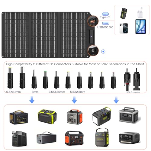 ?Multifunctional output?The solar panel is designed with multiple output ports: 1*QC3.0 USB (5V/3.4A, 9V/2.2A, 12V/2A), 1*USB C (5V/3A, 9V/ 2A, 12V/1.6A,), 1*DC Output: 16.5V/1.81A (max) can simultaneously charge your smartphone, laptop, tablet, ipad, GPS, USB fan, camera or other USB devices quickly . The built-in smart IC chip can intelligently identify your device and maximize its charging speed while protecting your device from overcharging and overloading