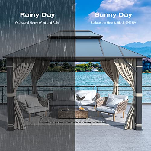 ?????Curtains & Nets?The hard top gazebo for patios is equipped with 4 privacy curtains and 4 net curtains with double-sided zippers. This user-friendly design can prevent mosquitoes, rain and ultraviolet rays. At the same time, under the premise of ensuring good ventilation, it also provides a safe and comfortable privacy space for your family.