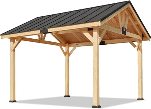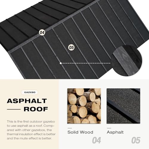 ?Unique Asphalt Roof?Asphalt has good thermal insulation, waterproof, anti-penetration functions, and can reduce the noise caused by rain. Asphalt has a light texture and can reduce the burden on a solid wood gazebo. The sturdy triangular construction allows the cedar gazebo to easily withstand up to 10 inches of thick snow. Allowing you and your family to safely spend spring, summer, autumn, and winter under this gazebo.