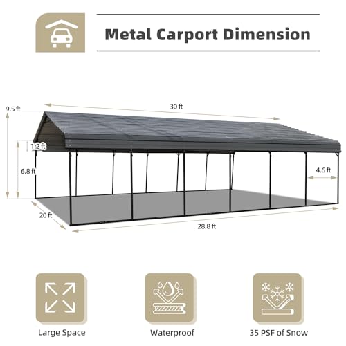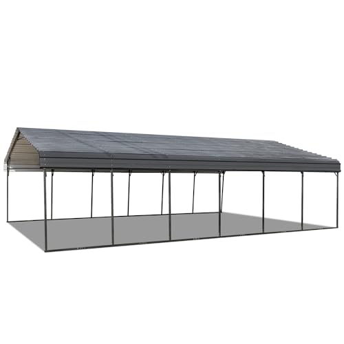 [Sturdy and Durable]: The outdoor metal carport Kit is a sturdy and durable shelter designed for all weather conditions. Unlike traditional canvas carports, this upgraded 20'x30' carport features a galvanized steel roof and a powder-coated steel frame. The galvanized steel roof is rust-resistant and provides superior protection for your vehicles