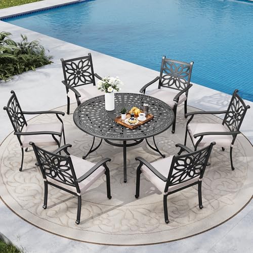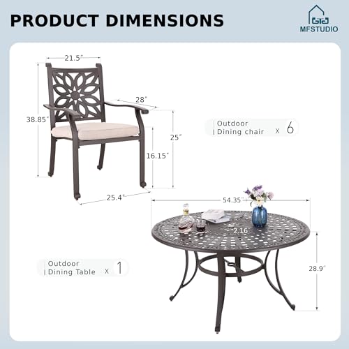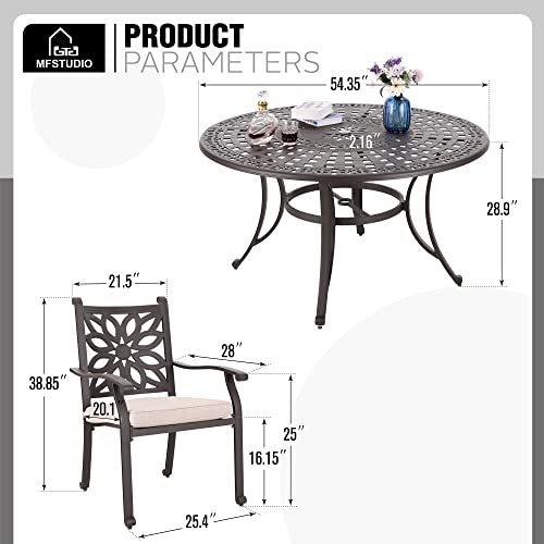 ROUND DINING TABLE: 54"Dia X 29.1"H round dining table can service up to 6 people, with 2.16" Dia umbrella hole suitable for mostly market umbrella.