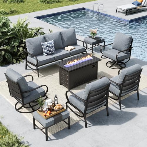 ?7/9 Seat Conversation Set?: 8 pieces patio furniture conversation set includes 2 x single padded cushion sofa chairs, 1 x deep seating 3 seater loveseat sofa ,2 x Swivel Chairs?1 x 45" Gas Fire Pit Table and 2 x cushioned Ottoman. The ottoman can be used as a footstool, a seat, or instead of the coffee table. So, such a set can seat 7-9 person