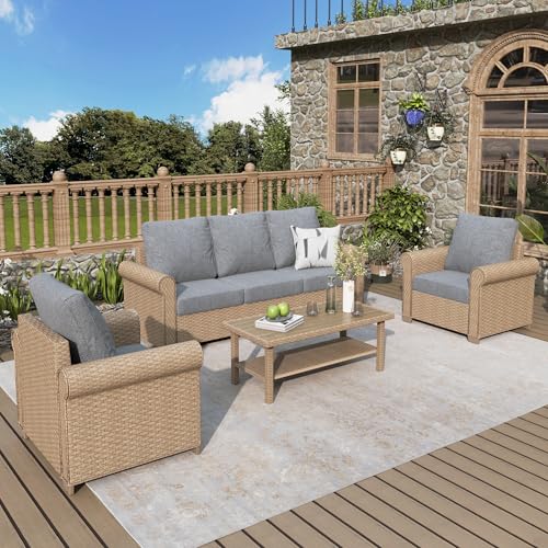 Outdoor Furniture Set 4 Pieces: Includes 2 x Single Chairs, 1 x 3-Seater Sofa, 1 x Coffee Table, matching seat cushions, and pillows. Perfectly fitting with your backyard, poolside, porch, garden, and deck to create an outdoor comfort zone for you.