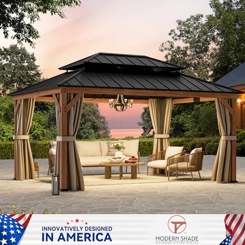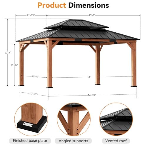 [Galvanized Steel Double-Tier Roof] This wood gazebo features a double-tier galvanized steel roof designed for superior ventilation and airflow. Its rust-resistant surface blocks up to 90% of UV rays, protecting you from direct sunlight while enhancing durability against strong winds and heavy rain. Perfect for year-round outdoor enjoyment.