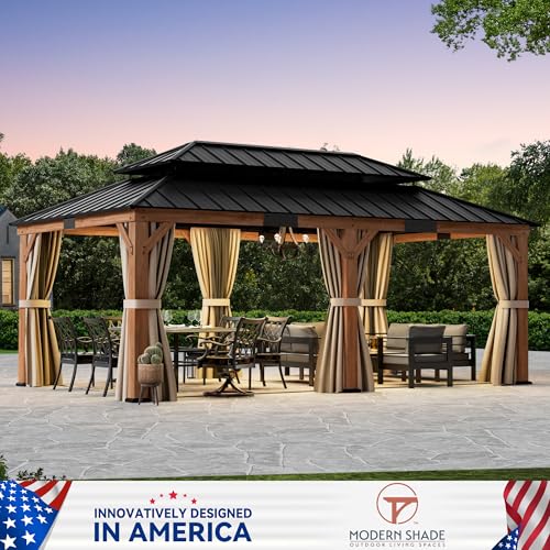 [Galvanized Steel Double-Tier Roof] This wood gazebo features a double-tier galvanized steel roof designed for superior ventilation and airflow. Its rust-resistant surface blocks up to 90% of UV rays, protecting you from direct sunlight while enhancing durability against strong winds and heavy rain. Perfect for year-round outdoor enjoyment.