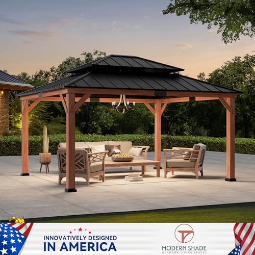 [Galvanized Steel Double-Tier Roof] This wood gazebo features a double-tier galvanized steel roof designed for superior ventilation and airflow. Its rust-resistant surface blocks up to 90% of UV rays, protecting you from direct sunlight while enhancing durability against strong winds and heavy rain. Perfect for year-round outdoor enjoyment.