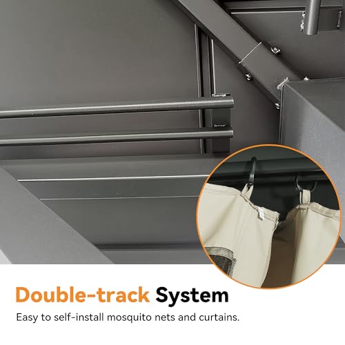 [STURDY CONSTRUCTION] Crafted with premium heavy-duty materials, our 10' x 12' metal gazebo's frames are sturdy, corrosion-resistant, and rust-proof. Additional expansion screws at the base provide extra reinforcement, ensuring stable installation in your backyard, patio or garden.
