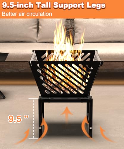 Powerful Air Circulation: Compared to other raised wood burning fire pits, the height of the supporting legs is increased to 9.5 inches above the ground, allowing the firewood to be elevated higher. The hollow design of the four side panels enables 360-degree airflow. These two features ensure good air circulation, promote efficient burning of the firewood, reduce smoke, and provide a more stable flame