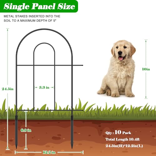 ?Perfect Size?: Each metal fence panel is 24.5" high and 12.2" wide, fencing rod clearance of 3", 10 panels in total, with a total length of about 10ft.The classic arched design adds a modern touch to your garden, backyard, front yard, patio or yard.
