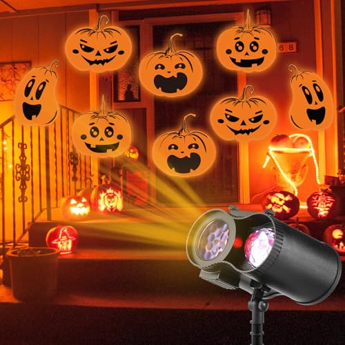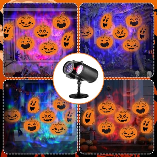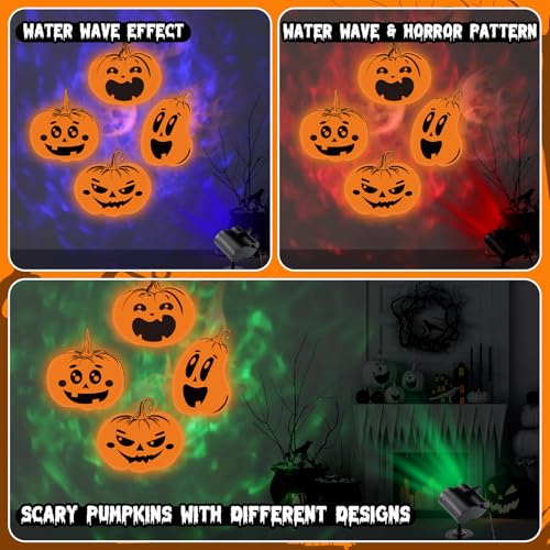 2-in-1 Horror Halloween Projector Lights: you will receive a pumpkin projector lights with power cord, a round base, a pointed stake and a remote control; The Halloween LED projector has 2 projection heads, one for RGB water wave ripple effect creates a hauntingly beautiful backdrop, and another for patterns image projection, the 4 different pumpkin images add a classic touch to your Halloween decor