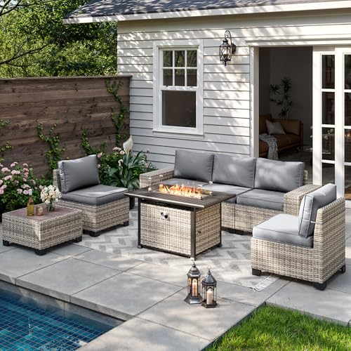 Includes: The 7-piece set includes 2 armrest sofas, 2 single sofas, 1 corner sofa, 1 coffee table and 1 fire pit table, providing ample seating for entertaining or relaxing. The ergonomic design and thicken cushions offer superior comfort. Designed for year-round use, this rattan furniture set features UV-resistant and waterproof materials, ensuring it withstands sun, rain, and humidity