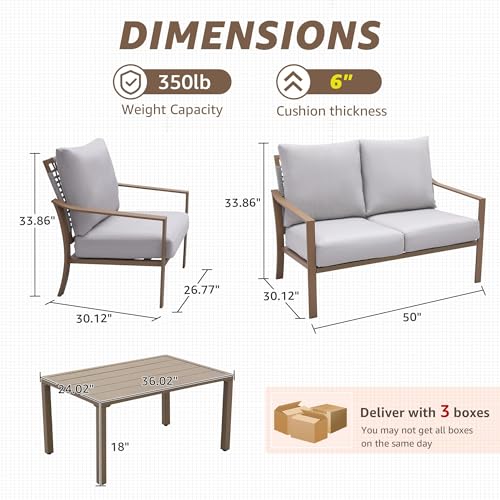 ?[Oversized Deep Seating,Easy Assembly]: Single Chair: 26.77"(L) x 30.12"(W) x 33.86"(H); Loveseat Sofa: 50"(L) x 30.12"(W) x 33.86"(H); Table: 36.02"(L) x 24.02"(W) x 18"(H). 4 piece deep Seating sectional sofa can hold 350 lbs for each seating. With straight-forward, easy-to-follow assembly instructions, you’ll be relaxing with your beverage of choice in your new favorite outdoor living space for years to come.
