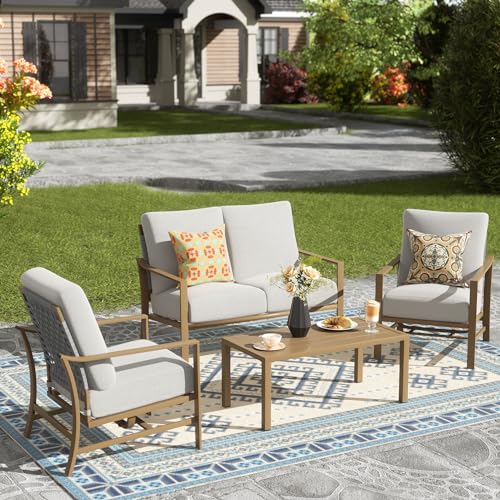 ?[6" Cushions, Incredible Comfort]: 4 piece outdoor furniture set has 6” thick cushions upholstered in olefin fabric for ergonomic optimal comfort.Filled with a high-resiliency sponge,metal outdoor patio furniture set cushions make you feel like lounging on a cloud for extreme comfort and relaxation. Cover is water resistant and removable to keep all cushions looking great for years of use.