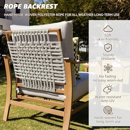 ?[Soft,Sturdy Rope Backrest]: Premium hand-woven rope feels soft like cotton, skin friendly but sturdy,water resistant,easy to clean.Ropes are delicate, resilient with Superior Craftsmanship,No fading, Anti-UV, no rust to withstand various outdoor weather for long-term use. Rope outdoor furniture sets is more sturdy, softer compared to wicker materials. Metal patio sets with rope backrest not only provides a touch of modern elegance but also enhance long-term use and more comfort.