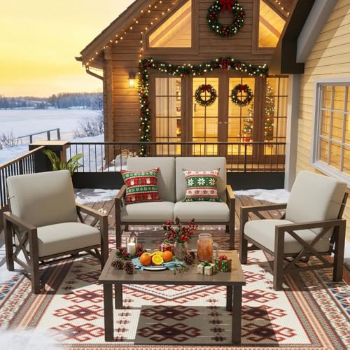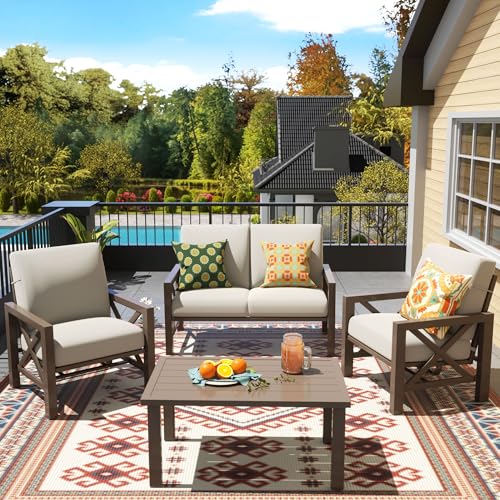 Modern Elegant Design,Unique Decor:With X-shape handrail and backrest, 4 piece outdoor metal patio set not only provides ergonomic optimal comfort but also a Unique Decor in garden,yard and poolside. 2 Single Chairs and loveseat are made with thick,strong pipes to sit safe with 2"armrest .Metal Coffee Table has adjustable feet to adapt to floors and increase stability of furniture set. Outdoor couch furniture is modern, chic and just right size for any space.