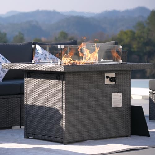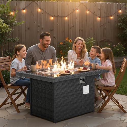 HIGHLY ADAPTABLE: Equipped with dual heating H-pipes, our rattan fire pit table delivers a powerful 60,000 BTU of consistent heat—producing strong, steady flames that enhance outdoor comfort and ambiance; the tempered glass wind guard helps maintain flame stability, even on breezy evenings; a built-in storage compartment discreetly houses a standard 20 lb propane tank (not included), keeping your outdoor setup sleek and organized