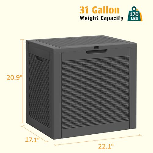 ??????HIGH QUALITY MATERIAL?This outdoor storage bin is made of high-density PP resin with excellent waterproof, sunproof and dustproof performance to withstand all kinds of harsh weather, while the rattan-like texture surface design adds a modern touch to your outdoor space.