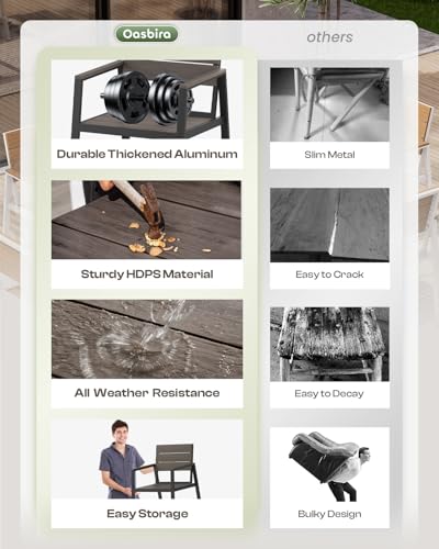 ?Premium Materials?This patio dining set features an aluminum frame with weather-resistant coatings, which make it lighter and stronger than iron. Also, its HDPS wood-like panels are UV-resistant and fade-proof, ensuring long-lasting beauty. Compared to conventional metal furniture, Oasbira outdoor dining sets are more sturdy and ideal for outdoor use.