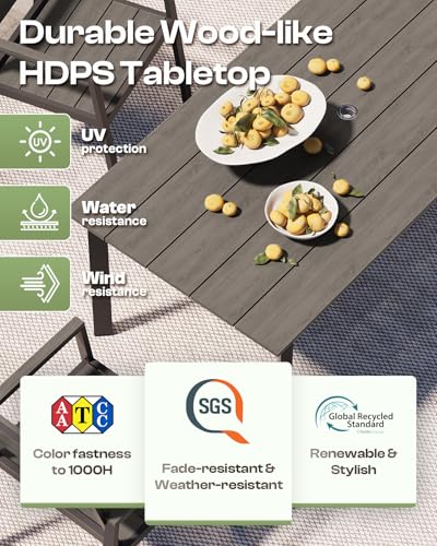 ?Comfy and Spacious Dining Table Sets?This patio dining chair features a 19" W and 17.5" D, supporting up to 350 lbs, with patio dining table supporting 280 lbs. Skin-friendly HDPS surfaces maintain comfortable temperatures year-round, unlike metal, which absorbs heat and cold. This outdoor dining table has a 1.77" umbrella hole for easy setup, offering a more comfortable outdoor dining experience.