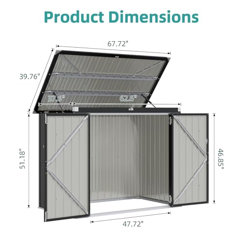Ample Space: With dimensions of 61.7"W x 37.5"D x 46.4"H, the outdoor storage shed offers ample space to accommodate garbage bins without concerns about insufficient internal storage capacity. Additionally, it can be utilized for storing outdoor supplies such as shovels, lawn mowers, ladders, bikes, or tents—helping you maintain an organized and tidy environment.