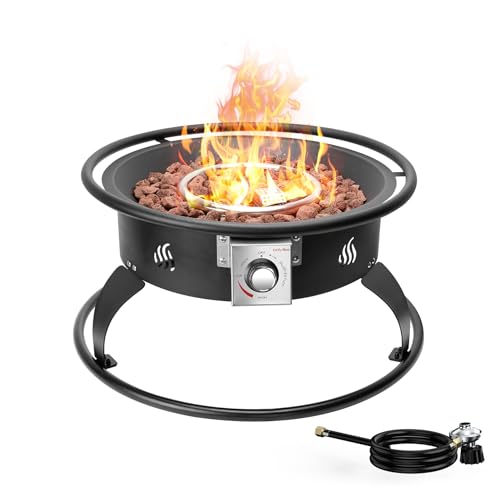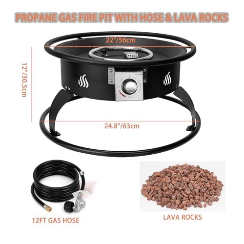 ?Fireplace with Lava Rocks & 12 FT Hose? - The outdoor fire pit is equipped with a 12 Ft hose, a fully adjustable safety shutoff valve and 8.8 lbs lava rocks. Overall 24.8 inch diameter x 12 inches high; The Base is 6 inches tall; Fire pit bowl is 5 inch tall x 17.6 inch in bottom diameter with total output of 55,000 BTU/HR, Weighs 30 pounds.