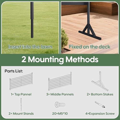 Easy to Install: Our privacy screen has two fixing methods, which can be fixed on hardened ground or inserted into a lawn. The manual provides detailed assembly steps. For indoor use, there is no need to fix it unless there is a risk of people bumping into it.
