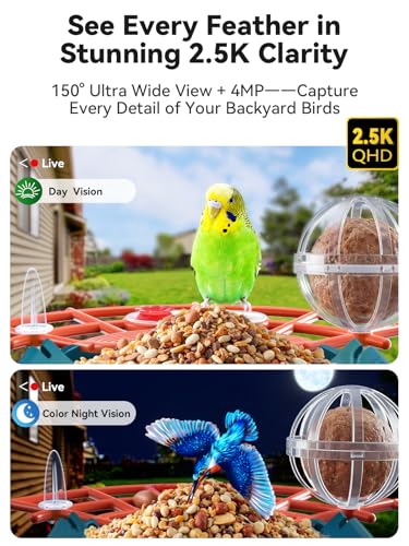 ?Unmatched Visual Experience, Enjoy Immersive Birdwatching?The Outinput Smart Bird Feeder with Camera is equipped with a 2.5K HD camera, delivering crystal-clear views of every bird’s feathers and movements. The 150° wide-angle lens captures more stunning moments, from birds soaring to feeding. With its color night vision, you can enjoy vibrant birdwatching even in the dark. Whether day or night, this feeder turns your backyard into a year-round bird haven