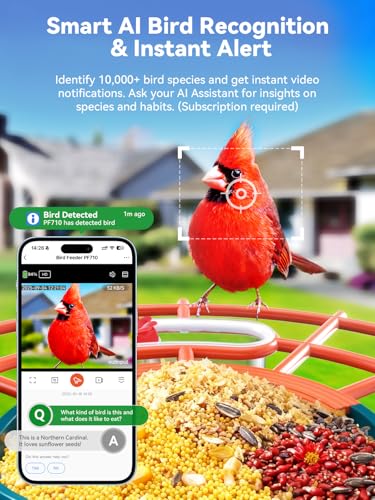 ?Smart AI Features to Explore Nature?With AI bird species identification, this bird feeder with camera can recognize over 10,000 bird species and provide detailed information, making it easy to learn about the birds in your environment. (7-day free trial, subscription required afterward.) Free AI assistant can also answer any bird-related questions, helping you better understand and observe the natural world around you