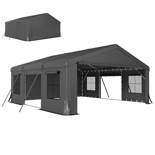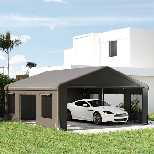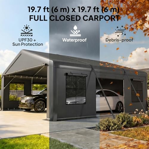 20 x 20 ft spacious carport: This UPF30+ PE covered carport provides generous space for multi-use from hosting outdoor events to protecting your car from debris, light rain and UV rays. The 5.9 in extended edges bury into the soil for added stability