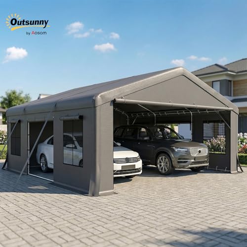 Galvanized steel frame: Built with multiple 1.5 in galvanized steel tubes and reinforced with stakes, screws and guy ropes, this portable garage stays firmly anchored on grass or hard surfaces, giving you added peace of mind in everyday outdoor use