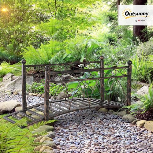 Antique Style Outdoor Décor: An elegantly arched bridge that pulls together the landscape of your garden, featuring a frame with top corner spheres and scrollwork flourishes. It instantly adds rustic, antique renaissance charm to any walkway.