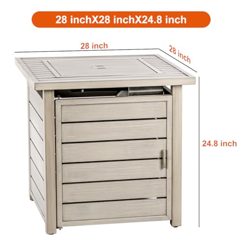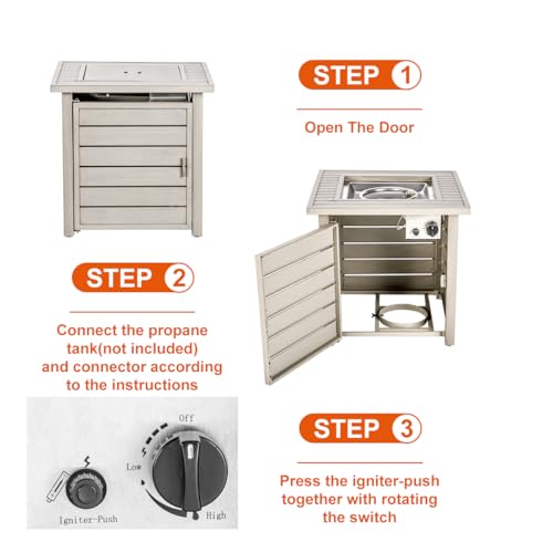 [Easy to Use & Smokeless Flame]The fire pit has with a quick start electronic ignition system and variable flame control. You can light up the fire pit table safely and adjust the flame to your desired temperature by turning the control button. The side door panel can be easily opened to change and conceal the propane tank, work with a standard 20-pound propane tank (NOT INCLUDED). Safety Note: When setting up the propane tank to keep the hose and valve away from the high-temperature area.