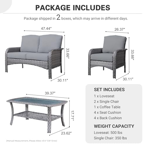 ovios 4 Pieces Patio Furniture Set, Outdoor Wicker Sofa with Coffee Table, Chairs, All Weather High Back Rattan Loveseat Couch with Comfy Cushions, Dark Grey