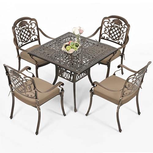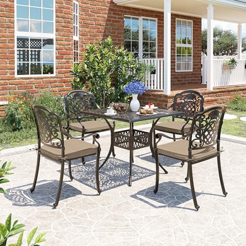 ?Ergonomic design?The chairs in this patio dining set are carefully designed for both functionality and aesthetics. Their backrests have hollowed - out vintage - style patterns, adding elegance. The curved, ergonomic armrests fit your arms naturally, offering great support and comfort.These chairs feature a cutout design that promotes air circulation to keep you cool on hot summer days.Comes with a comfortable removable seat cushion, giving you more options.